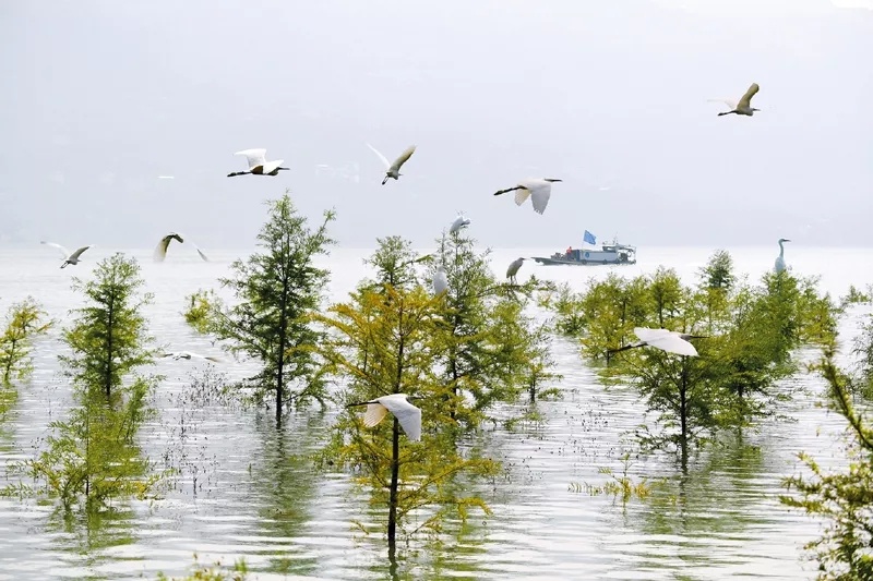 人民法院認(rèn)真貫徹落實習(xí)近平生態(tài)文明思想,努力為生態(tài)文明建設(shè)與綠色發(fā)展提供優(yōu)質(zhì)司法服務(wù)。在長江三峽庫區(qū),為解決庫區(qū)消落帶植物存活的治理難題,重慶法院引進(jìn)了耐淹耐旱的中山杉。圖為重慶法院長江三峽庫區(qū)生態(tài)修復(fù)司法保護(hù)示范林的中山杉在水庫蓄水時被部分淹沒的景象。最高人民法院供圖