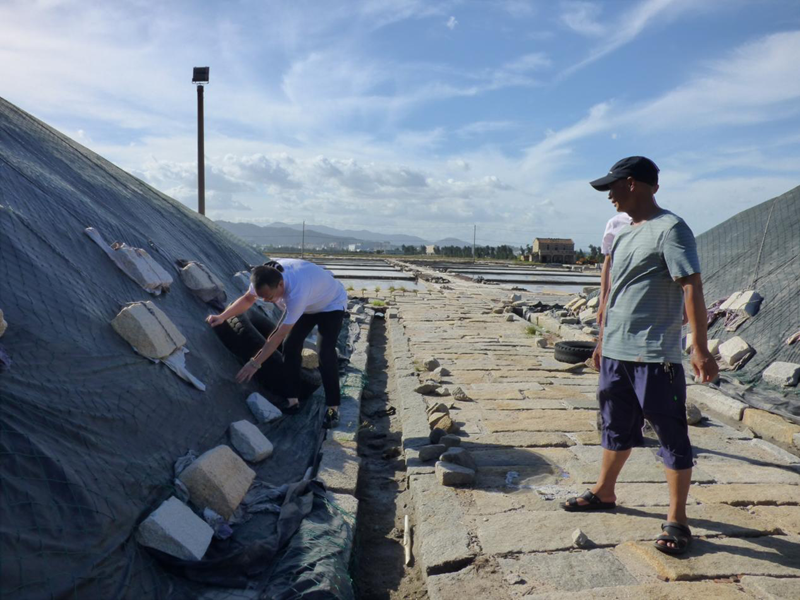 (圖為晶海輕化組織工作人員給鹽坨加固苫蓋)