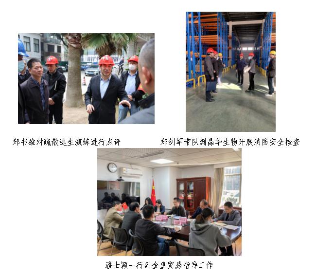 一是四下基層大督查。福建輕紡高度重視相關(guān)工作,多次召開會議,持續(xù)深入學習貫徹落實習近平總書記關(guān)于安全生產(chǎn)和消防工作的重要指示批示精神,全面構(gòu)建“黨政同責、一崗雙責、齊抓共管、失職追責”和“三管三必須”的消防安全防控體系。領(lǐng)導(dǎo)干部弘揚“四下基層”優(yōu)良作風,重心下移,多次到基層督導(dǎo)檢查工作。黨委副書記、副董事長、總經(jīng)理鄭書雄帶隊觀摩金皇物業(yè)疏散逃生演練并對其存在的不足之處提出具體意見;黨委委員、總會計師鄭劍軍帶隊到晶華生物開展消防安全檢查及生產(chǎn)經(jīng)營調(diào)研工作;黨委委員、紀委書記、監(jiān)察專員潘士穎一行到金皇貿(mào)易針對金皇大廈設(shè)施設(shè)備老化的安全隱患等問題交流解決思路。