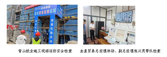 六是消防隱患大排查。進一步壓緊壓實消防安全責任,將消防宣傳月活動與鞏固深化消防安全重大風險隱患專項排查整治行動相結(jié)合,組織排查整治各類安全隱患。福建輕安組織對本部、消防重點項目(青山紙業(yè)、山東魯麗木業(yè))進行消防隱患重點排查,持續(xù)強化全鏈條安全隱患排查整治;金皇貿(mào)易領(lǐng)導(dǎo)帶隊前往消控室、機房、停車場等消防安全重點部位,認真仔細開展安全檢查工作,及時、妥當處理潛在安全風險隱患。