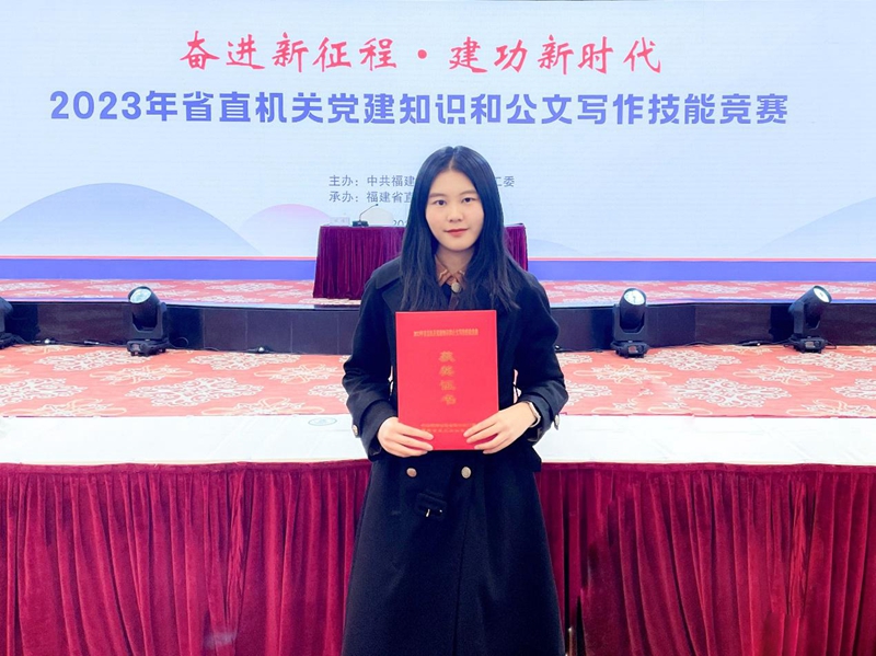楊文嘉同志畢業(yè)于中國(guó)人民大學(xué),于2023年8月進(jìn)入福建輕紡紀(jì)委工作。此次獲得技能競(jìng)賽一等獎(jiǎng),既是對(duì)其理論知識(shí)積累和業(yè)務(wù)能力功底的肯定,也是對(duì)其潛心學(xué)習(xí)、積極提升履職本領(lǐng)的優(yōu)良作風(fēng)的肯定。