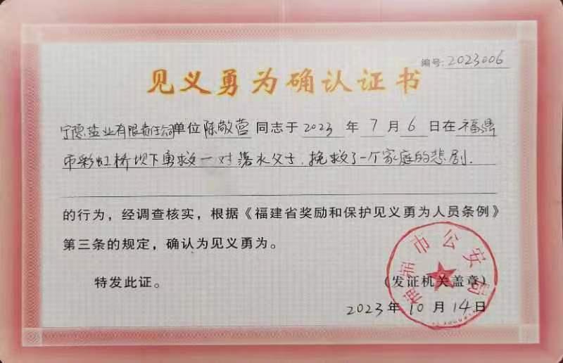 陳敬營(yíng)同志7月6日晚8時(shí)左右因勇救落水群眾事跡被寧德鹽業(yè)黨支部授予“見(jiàn)義勇為員工獎(jiǎng)”,并在省國(guó)資委、福建輕紡、福鹽集團(tuán)網(wǎng)站進(jìn)行宣傳報(bào)道弘揚(yáng)學(xué)習(xí)。經(jīng)寧德鹽業(yè)公司積極申報(bào),公安部門(mén)調(diào)查取證,福鼎市公安局于10月14日向陳敬營(yíng)同志頒發(fā)了“見(jiàn)義勇為確認(rèn)證書(shū)”(證書(shū)編號(hào)2023006)。