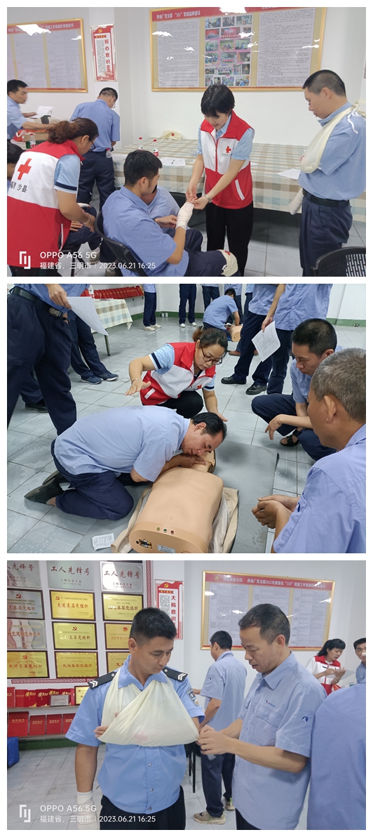 本期培訓(xùn)分為線上理論培訓(xùn)和線下實操培訓(xùn)。在學(xué)員們順利完成了線上理論培訓(xùn)課程后,公司于6月21日邀請沙縣區(qū)紅十字會常務(wù)副會長樂梅金等3位應(yīng)急救護師開設(shè)“沙縣區(qū)2023年為民辦實事項目——救護員培訓(xùn)班”。老師們多年深入學(xué)校、企業(yè)、社區(qū)從事應(yīng)急救護知識宣傳,擁有豐富的應(yīng)急救護經(jīng)驗,為學(xué)員們認真培訓(xùn)了“心肺復(fù)蘇術(shù)操作(CPR+AED)”“氣道異物梗阻處置”“ 繃帶包扎”和“三角巾包扎”等急救技能。