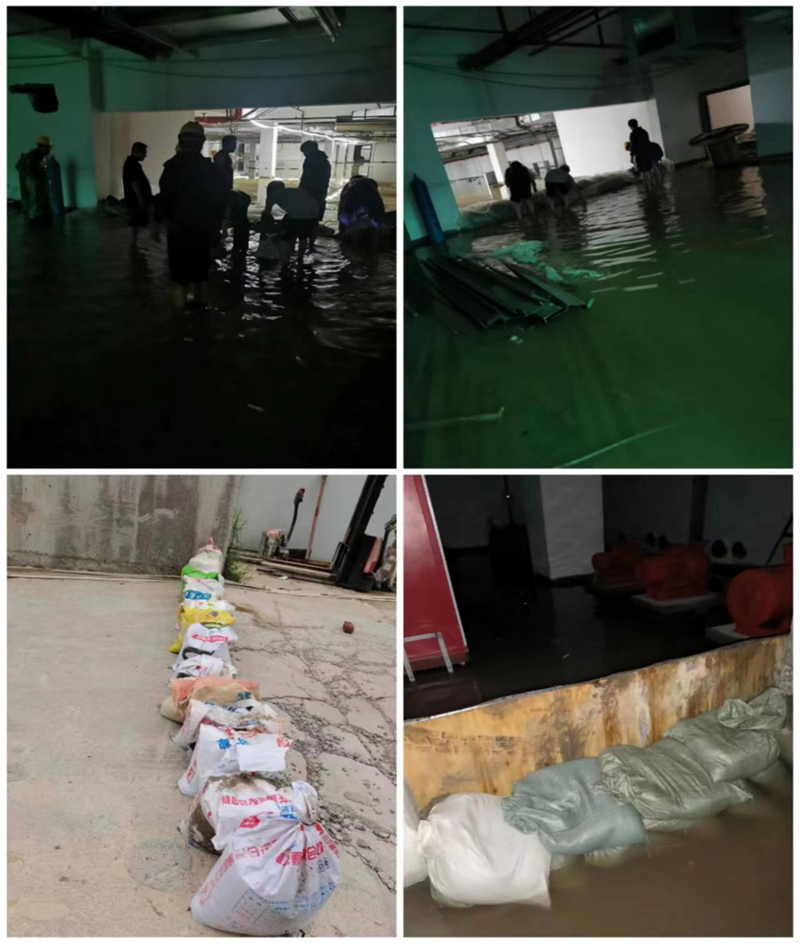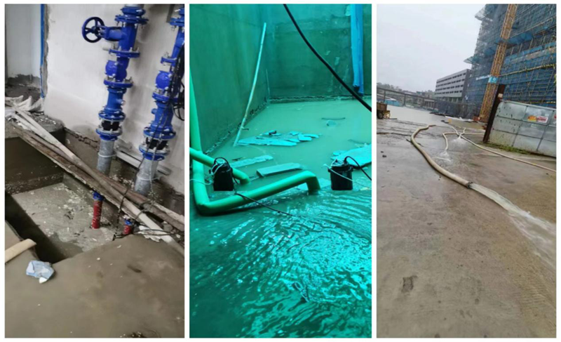 7月29日凌晨3:30,項(xiàng)目所在地再次下起了大暴雨,隨著降雨量加大,2#樓北側(cè)圍墻外內(nèi)河河水倒灌,項(xiàng)目工地積水水位不斷上漲,地下室集水坑臨時水泵由于出水口積水水位比出水口高,所以導(dǎo)致臨時水泵無效,險情再次出現(xiàn)。搶險突擊隊(duì)迅速在2#樓北側(cè)圍墻外內(nèi)河河水倒灌口處,筑高堤壩進(jìn)行攔堵河水倒灌;加高圍堰,攔截雨水進(jìn)入地下室;重新規(guī)劃抽水泵位置,將雨水排放到市政雨水井,防治雨水再次倒灌;在地下室生活泵房四周用沙袋筑起圍堰防止雨水流入,浸泡設(shè)備,并對地下室生活泵房集水坑臨時水泵進(jìn)行疏通,降低泵房水位;在空調(diào)機(jī)房四周進(jìn)行圍堵,減少雨水流入浸泡機(jī)房;增加兩臺5.5KW大功率水泵進(jìn)行排水,降低機(jī)房水位。