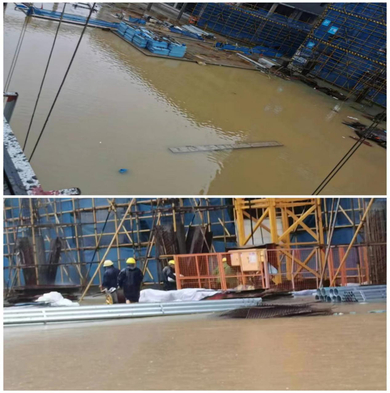 7月28日上午9時55分在晉江沿海登陸,受臺風(fēng)影響福州連降暴雨。至28日晚19:30,隨著雨量加大,工地多處出現(xiàn)險情:5#樓底一處排水管雨水倒灌、2#樓地下室頂板塔吊處雨水倒灌、3#樓集水坑在外墻的臨時抽水泵雨水倒灌、3#樓地下室頂板排水口堵塞、1#樓一層虹吸管出現(xiàn)脫落,大量雨水灌入地下室,造成大面積積水。接到險情報告,分公司經(jīng)理陳昌焰迅速組織堅(jiān)守一線的黨員干部、項(xiàng)目部管理人員以及搶險突擊隊(duì)展開防御搶險,在5#樓底下雨水倒灌的排水管地下室外墻處,開挖、清理回填空隙,對洞口四周進(jìn)行圍堵,攔截倒灌雨水;在2#樓塔吊四周加高圍堰攔截雨水進(jìn)入地下室;封堵3#樓地下室外墻雨水倒灌口;疏堵3#樓地下室頂板排水口;對1#樓一層脫落的虹吸管重新進(jìn)行安裝;增加抽水泵迅速抽排積水。經(jīng)過近4小時奮戰(zhàn),地下室倒灌雨水基本將清理干凈。