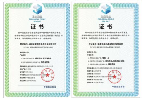 其中,福建省莆田市晶秀輕化有限公司及福建省泉州晶海輕化有限公司生產(chǎn)的食鹽產(chǎn)品還通過了《生態(tài)海鹽評價技術(shù)規(guī)范》標(biāo)準(zhǔn)評審,獲得全國第一家生態(tài)海鹽認(rèn)證證書。
