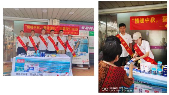 漳州鹽業(yè)黨總支開展“情暖中秋,喜迎國慶”主題黨日活動(dòng),各黨支部黨員發(fā)揮先鋒模范作用,堅(jiān)持?jǐn)[攤設(shè)點(diǎn)、走村入戶入店巡訪市場、加強(qiáng)宣傳,了解餐飲、食堂、農(nóng)村人群、城市人群閩鹽食用情況,結(jié)合濃厚的節(jié)日氛圍,開展品牌宣傳活動(dòng),宣傳科學(xué)用鹽的健康理念。