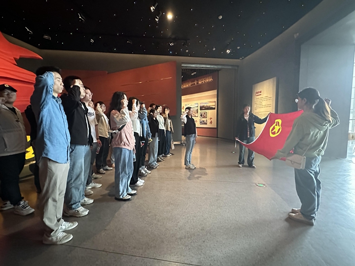 活動(dòng)最后,團(tuán)員青年們高舉右手,在鮮艷的團(tuán)旗下重溫入團(tuán)誓詞。鏗鏘有力的誓詞回蕩在現(xiàn)場(chǎng)每一位團(tuán)員青年心中,提醒著每一位團(tuán)員青年要銘記團(tuán)員使命,不忘入團(tuán)初心。