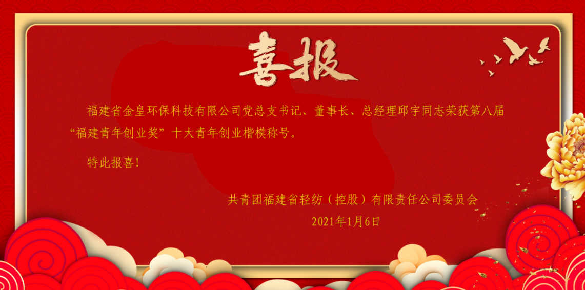 日前,共青團(tuán)福建省委公布第八屆“福建青年創(chuàng)業(yè)獎(jiǎng)”表彰對(duì)象名單。經(jīng)主辦單位和專家?guī)煸u(píng)委聯(lián)合評(píng)審,并經(jīng)團(tuán)省委書記會(huì)研究確定,共有50名同志獲得相關(guān)獎(jiǎng)項(xiàng)表彰。其中,福建輕紡權(quán)屬福建省金皇環(huán)??萍加邢薰军h總支書記、董事長(zhǎng)、總經(jīng)理邱宇同志榮獲“十大青年創(chuàng)業(yè)楷?!狈Q號(hào)。